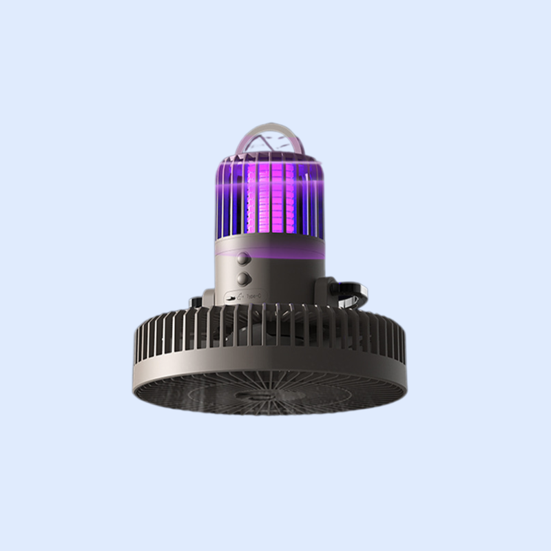 Outdoor USB charging ceiling fan combines mosquito killer, desktop lamp, and tripod. Portable, multifunctional, energy-efficient, and suitable for camping or home use.