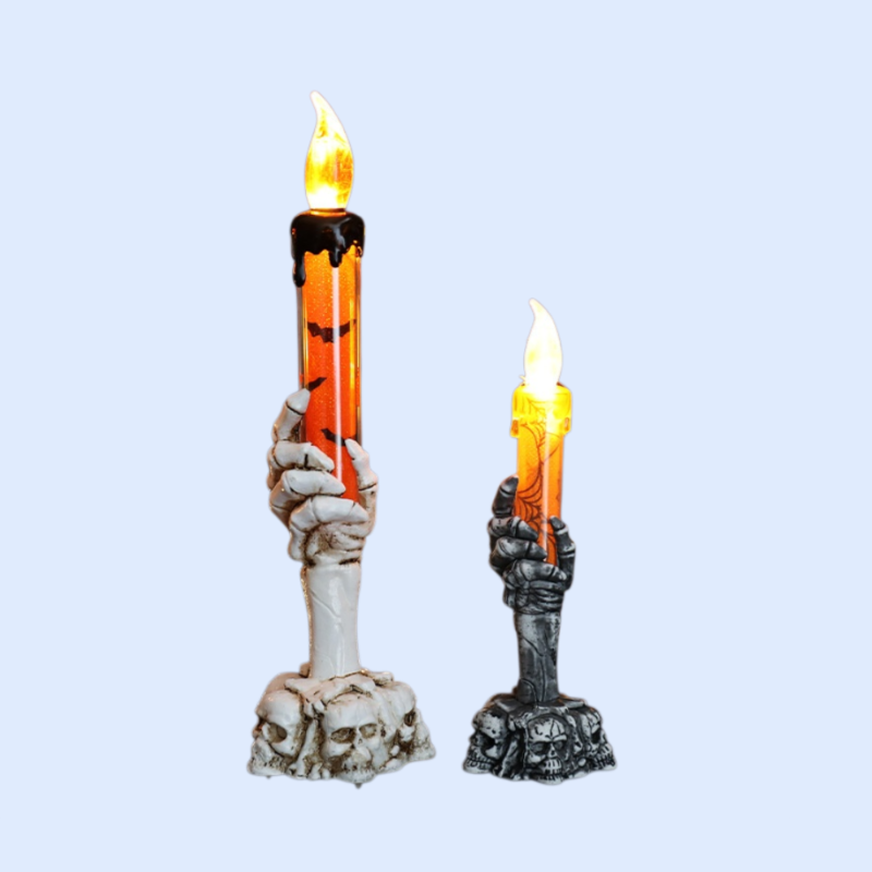 Unique ghost hand design, durable resin material, fits standard candles, perfect for Halloween decor, easy tabletop placement, enhances spooky ambiance, great for party displays.